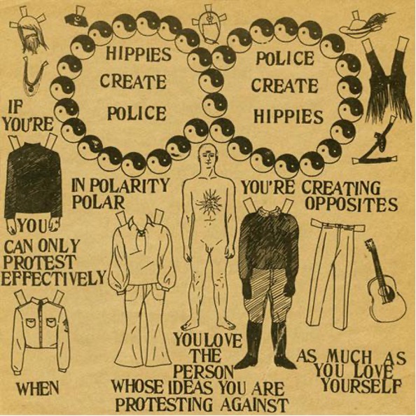 On a wall in my apartment hangs a prayer flag. The image on the flag is taken from a page in spiritual leader Ram Dass’s book Be Here Now. It shows an illustration of a man, stylized like a paper doll, with multiple options for his garb: bohemian, flower child choices including a guitar and long hair and a beard, as well as the getup of law enforcement officers. The text says: “Hippies create police. Police create hippies. If you’re in polarity, you’re creating polar opposites. You can only protest effectively when you love the person whose ideas you are protesting against as much as you love yourself.”[1]